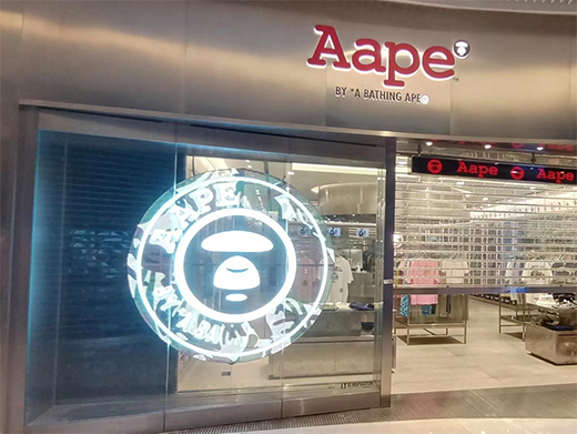 Aape是香港I.T集團的知名日系街頭潮牌,智彩科技為廣州天環廣場Aape門店量身定制透明led顯示屏